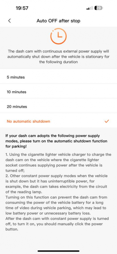 Araç içi kameranız aşağıdaki güç kaynağı modlarını benimsiyorsa, lütfen park için otomatik kapatma işlevini açın!
